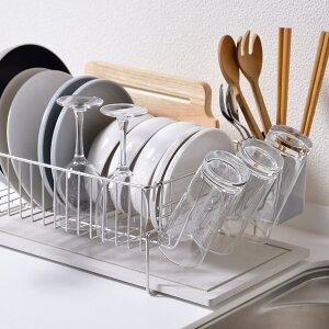 【商品説明】●シンクサイドに置けるタテ置きスリム設計です。家族分の食器もたっぷり入る大容量サイズです。8mm間隔ワイヤーで大皿も小皿も立てて水が切れます。買い足し不要の便利な付属品付きです。乾きが早いワイヤー型カトラリー