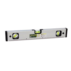 ■特長 ・気泡管は日本製です。 ・見やすい拡大レンズと配管測定に便利なV溝付です。 ・6本線気泡管で、1/100勾配、2/100勾配が測定できます。 ・衝撃に強いプロテクタ付です。 ・軽くて持ちやすいアルミニウム製です。 ・両面目盛付です。