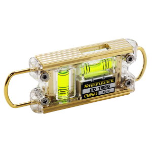 水平器メーカー「エビス」とのコラボ商品!金色に輝く、圧倒的な存在感のある水平器です。水平、垂直、45°測定に。【特長】従来品3倍の超強力磁石で、鉄骨工事に便利です。落下防止コード対応シャックルとカラビナ対応の大型シャック