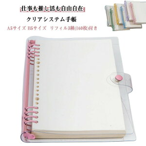 クリアシステム手帳A5サイズ B5サイズリフィル3種(160枚)付きコンパクトなA5サイズ/B5サイズのクリアシステム手帳です。透明なPVC(ポリ塩化ビニル)製のカバーを採用しており、カバーの内側にお好みの写真やイラスト...