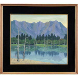 穂高連峰と原生林を映す湖面と立ち枯れの木々絹本日本画技法:日本画作品サイズ:変型10号額のサイズ:高さ63cm×幅70cm×奥行き5.0cm作品の状態:良好です武藤彰(むとうあきら / MUTO Ak...