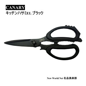 CANARY キッチンハサミ EL ブラック 本物のギザ刃加工。食材を逃がさず確実にカット。 握りやすい厚めのソフトハンドル。少々強く握っても手は痛くありません。 食洗器対応。分解して洗えて、常に清潔な状態でご使用いただけます。 肉たた