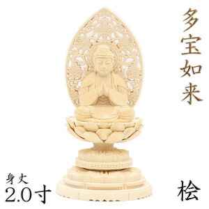 【材質:桧木】 【総高19cm、幅10cm、奥行き9cm】多宝如来 東方の宝浄世界の教主。 法華経・見宝塔品で、法華の説法のある所に宝塔を出現させ、説法の真実を証明し讃嘆(さんだん)し、半座を譲って釈迦を請じ入れたという仏。 多宝塔に安置