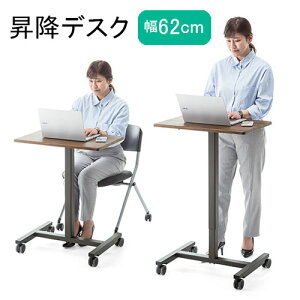上下昇降幅約34cmのデスク。座って使ったり立って使用することも可能。ガス圧式昇降で少しの力でも上下昇降可能。移動に便利なストッパー付きキャスター標準装備。<特長>●ガス圧で上下昇降できる昇降式デスクです。●上下昇降の幅は