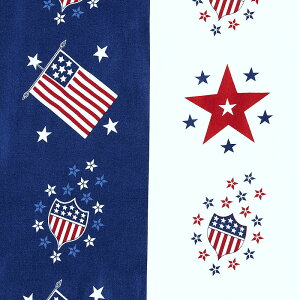 星と星条旗とワッペン型の星条旗が配置されたストライプ柄。 白とネイビーの幅が13.7cmと太いストライプ上に星と星条旗とワッペン型の星条旗が配置されています。 エプロンやシャツやカフェカー...