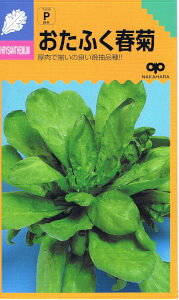 肉厚で揃いの良い晩抽品種!おたふく春菊特長葉は淡緑色の極大葉で欠刻浅く、外観は金せん花の葉に似て良く揃う。厚肉柔軟で香気に富む。草姿は半立性で、揃いがよく出荷調整が楽である。生育は初期より旺盛で、側枝の分枝性も高く...