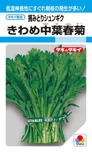 特性 ?極早生の摘み取りタイプの春菊。 ?開張性と側枝の発生が良い。 ?香り極めて良く生育旺盛。特に低温伸張性に優れる。 ?栽培の適応性広く周年栽培ができる。 栽培のポイント ?側枝を摘み取る場合は、株間を広くとり...