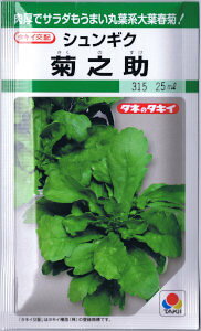 肉厚で食味のよい丸葉系の大葉春菊!タキイ交配 シュンギク 菊之助特性●丸葉系の大葉春菊西日本でおたふく春菊と呼ばれる、特に葉の切れ込みの少ない鮮緑の丸葉系大葉春菊。●肉厚で食味にすぐれるシュンギク特有の香りがまろやか