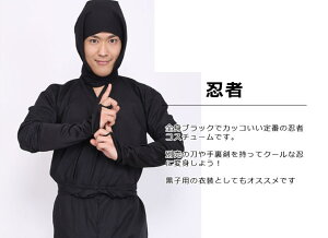 全身ブラックでカッコいい定番の忍者コスチュームです。別売の刀や手裏剣を持ってクールな忍に変身しよう!黒子用の衣装としてもオススメです ※靴下は付属しておりません 【セット内容】 ・上着×1 ・パンツ×1 ・頭巾×1 ・