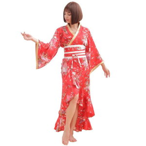 【商品説明】ロング丈でゴージャスなデザインの花魁風コスチュームです。赤地に花柄で目立ち度も大!華やかにセクシーに着こなしてくださいね【セット内容】・着物×1・帯×1・帯紐×1・飾り結び×1※上記以外は付属しません【サイズ】・