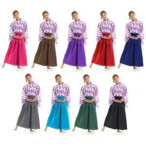 着物に似合う時代劇風の和装カラー袴です。 巫女や神主など現代の和装や、武道 弓道などのスポーツコスプレにも利用できます。 腰板付きでフリーサイズ、後ろと前でひもを結べば簡単に着用できます。 白の上衣やカラー着物と組み合わせ