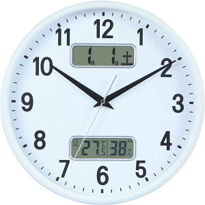 温度・湿度計付き壁掛け電波時計です。 厚さ(mm)54 高さ(mm) 色パールホワイトシルバー 直径(mm)350 電源時計用単3アルカリ乾電池×2本、ライト用単2アルカリ乾電池×3本(付属) 電池寿命約1年 電波40/60kHz、オ...