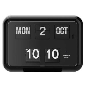 とても見やすいTWEMCOのクォーツ式置き掛け兼用時計です。 黒い表示板に白い文字と黒い本体ケースのコントラストが爽やかでスタイリッシュ! アナログ式の時計と曜日、日付、月の文字が整然と配置され、とても使い易くシンプルなデザイ