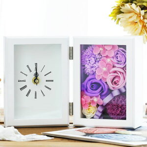 特殊な薔薇のプリザーブドフラワーで飾られた時計&フォトフレームです。文字盤はラインストーンの豪華仕様。マットの調整することで、L版(サービス判)でもポストカードサイズでも、たて向き写真でも横向き写真でも飾ることができます...