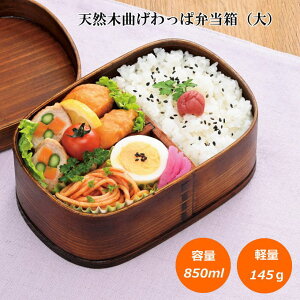 ,曲げわっぱ弁当(大)の解説 ナチュラルな木の温もりで、毎日のお弁当をもっと美味しく 天然木を使用した曲げわっぱ弁当箱(容量850ml)。 うるし仕上げならではの艶やかな質感と、ナチュラルな木目が魅力です。 木が水分を適度に吸収し