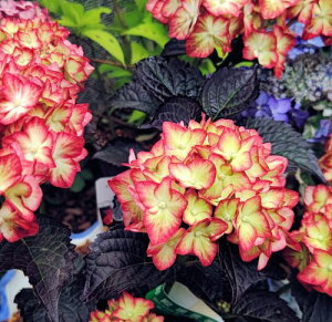 9センチポット 樹高10センチ程度 アジサイ ライトマイファイヤー:ライムグリーン〜花弁の縁に赤いぼかしが入るバイカラー咲きの紫陽花。葉もシックな黒〜銅茶色に変化する。