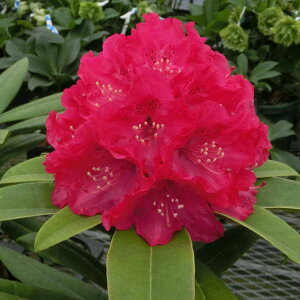 サイズ:6号 お届け時期:随時お届け [シャクナゲ レッドアップル] 少し紫みを帯びた赤桃色の中輪で、20輪ほどが整ったピラミッド状の隙間のない花房を作ります。葯のクリーム色がよく目立ちアクセントになっています。花付きが良いので