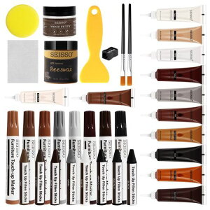 【セット内容】?補修クリーム*12色、補修ペン*8色、補修棒*8色、100gウッドパテ*1、80g蜜蝋*1、スポンジ*1、ブラシ*2、芯削り器*1、スクレーパー*1、サンドペーパー*1、説明書。?何かご不明な点がございましたら、いつで...