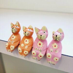 ちょこんとお座りできる花柄模様の猫の木彫りです 小さいサイズ同色2個セット(サイズ感は掌に載せた画像をご覧ください) 耳の形や表情がどことなく違います 窓際やチェストの縁にお座りできます お使いのディスプレイによって実際の色と