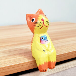 パッと目をひく明るさのネコの木彫りです 棚やチェストの縁にちょこんとお座りできます 胸元にはお魚が顔を出しています アジアン雑貨は小さな傷やペイント剥がれ・ペイント移りなどか見られる場合があります 気になる方はご購入お控え