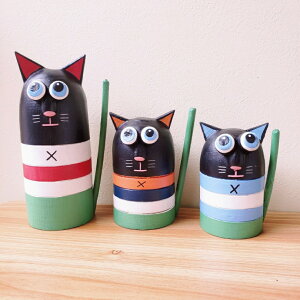 のんびりした顔が愛らしいボーダー服のねこ 3サイズセットになります だるま落としの様なデザインのボーダーペイントです 底面は作成時にできた穴が開いています アジアン雑貨は小さな傷やペイント剥がれ・ペイント移りなどか見られ