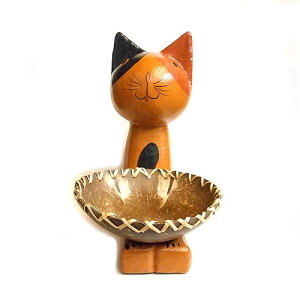 バリ島の人気アイテム木彫りのミケネコがココナッツの 実を持った小物入れが登場。 ほのぼのとした癒し系の大きな目と顔がとてもキュート。 天然の椰子と木を使い手作りしている為、 少しずつ大きさや形が違うのも特徴的。 お皿の上に