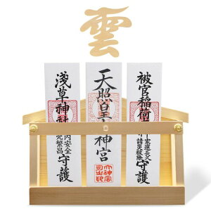 【神具セット&神棚、雲板付き】天然木を使った松の神具『神棚』『雲』。モダンなデザインで和洋室どちらのお部屋の雰囲気にも馴染む神聖な簡易神棚です。 通常配られる頒布大麻を三枚お祀りすることができます。裏面はフラットで、置き型、壁掛けどち...