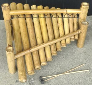 サイズ 全幅:約55cm、一番長い鍵盤の長さ:約60cm。 材 質 竹(孟宗竹) 商品説明 バリ島の竹琴リンディック(またはティンクリック〜大きいものをジェゴグと言います)です。音階はガムラン特有の5音階で、11鍵(2オクターブ)並ん...