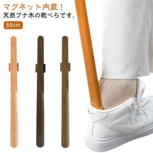 天然ブナの木を使用していて、木製の温かい作りが特徴です。靴ベラの長さは55cm。椅子に座ったままでも、立ったままでも使いやすい長さです。マグネット式で壁やドアにピタッと貼れます。木製