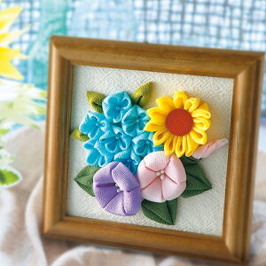 四季の花々が楽しめるつまみ細工キット。ボンドだけで作れて、針・糸は不要です。木製フレーム付きですぐに飾れるのも嬉しい♪スタンド付きなので、壁掛けだけでなく立てかけても。まあるい朝顔に向日葵にと、夏満開です...