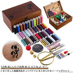 10色糸いり/39色糸入り2タイプ!こまごました裁縫用品をコンパクトにまとめられるソーイングセット。丈夫な木素材なので中身を衝撃から守ってくれます。充実のセット内容、基本的なものが全て揃っています。シンプルなフォルムで...