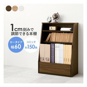 1cmピッチで棚板高さが調節できるシンプルなデザインの本棚。下に行くほど奥行が広くなっており、引出しには日用品の収納もできます。幅60cm。生産地:マレーシア製。サイズ:(約)幅60×奥行30×高さ85cm...
