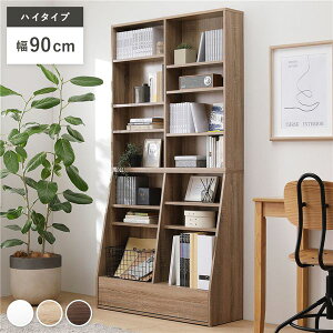 1cmピッチで棚板高さが調節できるハイタイプの大容量本棚。下に行くほど奥行が広くなっており、引出しには日用品の収納もできます。【サイズ(外寸)】(約)幅90×奥行30×高さ175cm。