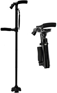杖 折りたたみ 軽量 自立式 伸縮式 5段階調節 男性 女性 介護 ステッキ 4点杖 ダブルハンドル LEDライト付き ストラップ付き おしゃれ 黒 コンパクト たためる 軽い 長さ調整可能 滑り止め...