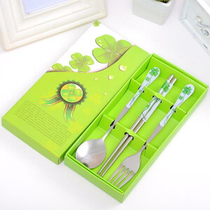 カトラリーセット・素材: 金属・研磨加工: 水研磨(機械研磨)・セット内容: スプーン、フォーク、箸・種類展開: 青花瓷(青)、四つ葉のクローバー(緑)、年々有余(赤)、紫ローズ(紫)、ピンクロース(ピンク