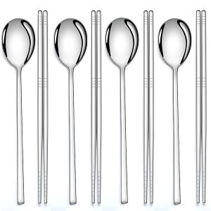 AOOSY スプーン 箸 4人用8点セット 食洗機対応カトラリーセット 四角形柄 韓国食器 ステンレス鋼製 鏡面仕上げ シルバー 軽いお箸 中空箸 来客用箸 業務用ブランドAOOSY色箸スプーン4セットモ...