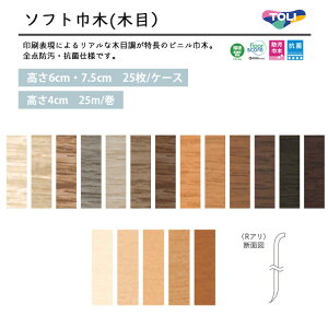 メーカー希望小売価格はメーカーカタログに基づいて掲載しています 商品詳細東リ ソフト巾木(木目)ロング巾木(木目) Rアリ 長さ90.9cm・25m巻 高さ6cm・7.5cm・4cm 全点防汚・抗菌仕様。