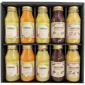 ッと凝縮したフルーツドリンクと果汁100%のヨーロピアンスタイルスムージーのセットです。■商品名:果樹物語 国産果汁のドリンクスムージー10本セット■箱種類:化粧箱■箱サイズ:約300×2