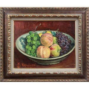厚塗りで力強く豪華に描かれた静物画落ち着いた色調と安定した構図が、見る者に安心感を与えてくれます。技法:油彩画作品サイズ:F6号額のサイズ:高さ49cm×幅58cm×奥行き6.0cm作品の状態:良好です萩谷巌(はぎのやいわお / HA...