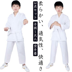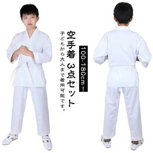 子供〜大人 100-180cm 上下白帯3点セット ポリエステル・綿混紡生地綿混生地で乾きやすい、耐久性も十分です。柔らかく、肌触りはめっちゃよいです。軽量の薄い生地のため非常に動きやすく、組手に最適な空手着です。空手着は、すばやい動
