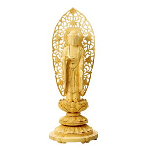 ◆お仏壇にお祀りする御本尊(仏像)です 柘植は重要な印鑑にも使われる堅い材質で 耐久力があり美しい木肌は大変人気があります 繊細で丁寧に仕上げた彫刻は仏像師の匠の技 顔が自慢のお仏像なら仏縁堂へ 光背:仏様が発する光(後光