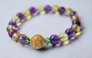 広隆寺・弥勒菩薩半跏思惟像を模して、御尊名を力強いの闘龍文字で 精緻に彫り上げた12ミリの柘植玉。高貴な紫のアメジストと風水で金財運 を象徴する黄色のシトリンでまとめた、男女兼用のお守りブレスレットです...
