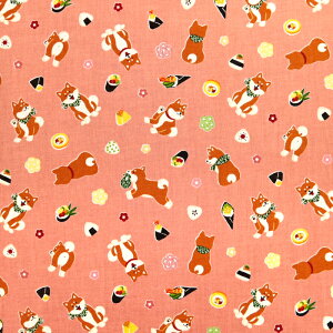 かわいい柴ワンコ柄の生地。和風の市松柄に桜が映えるものと、おいしそうなおにぎり持ってお散歩している総柄の2種 ♪ 小物作りにおすすめ。50cm単位の価格です。 幅:約108cm前後 素材:シーチング...