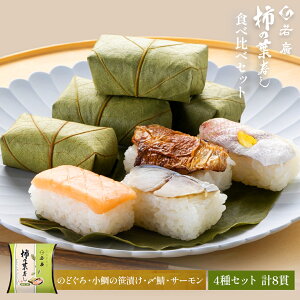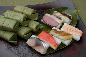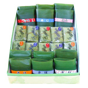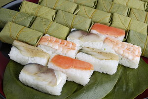 内容量 柿の葉寿司:鮭4個、鯛2個、鯖2個、鯵2個笹寿司:鮭2個、鯖2個、鯛2個、かに2個、鯵2個、えび2個 原材料 酢飯[米(国産)、もち米(国産)、調味酢]、鮭、鯖、桜鯛、鯵、カニ、海老、生姜の酢漬、レモン、昆布、ぶどう糖果糖液糖