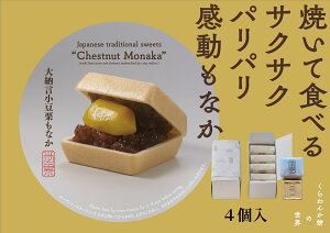 ・名称:和生菓子/栗もなか ・内容量:1個 約60g×4個 ・最中のサイズ:縦6cm×横6cm×高さ2.5cm ・箱のサイズ:縦14.5cm×横7.5cm×高さ8.5cm ・原材料:砂糖(国内製造)...