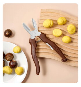 栗剥き楽々〜ハサミタイプの栗の皮むき器。握りやすく疲れにくい形状設計だから手軽で便利!作業手順1、皮むき器で栗の背に切れ目を入れる。2、終わったものをボールなどに入れ熱湯を注ぎ2~3分浸けておく。3、取出したら包丁などで浮い