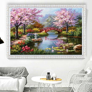 立派なインテリア絵画になります! ※掲載写真と多少色の出・発色が異なる場合がございますのでご了承下さい。 【デザイン】 わびさびのある春・桜満開の日本庭園のデザインです...