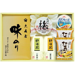 ●商品名/香味彩々 紀州南高梅 日本茶 NK-353●商品内容/大森屋味のり(8切8枚×2)、静岡煎茶40g、静岡深蒸し茶40g、紀州南高梅80g(塩分約8%)、たまごスープ6.4g×2、マルハニチロ...