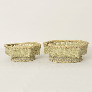 岩手県鳥越地区のすず竹で編まれた高台付きの六角盛りかご。器置きやパン、果物の盛り付けに映える、存在感あるかごです。