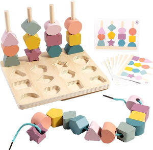 指先訓練と知育を同時に。多機能なカラフル木製紐通しおもちゃ。 紐通し、棒通し、型はめ、積み木など多機能な知育玩具で長く遊べる。組み合わせを示すカードで考える力をはぐくみ創造性を開花させます。モンテッソーリ教育の視点から